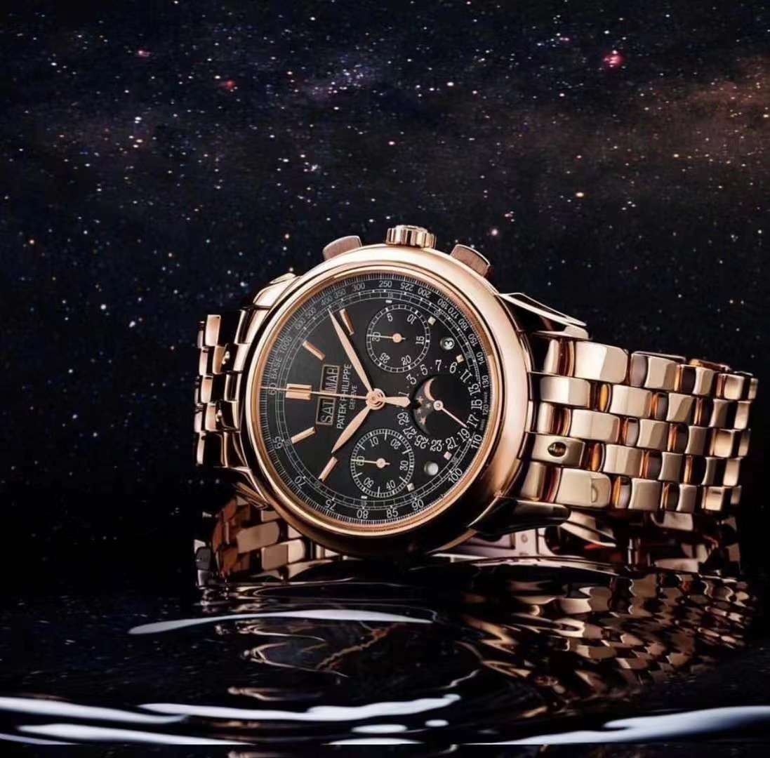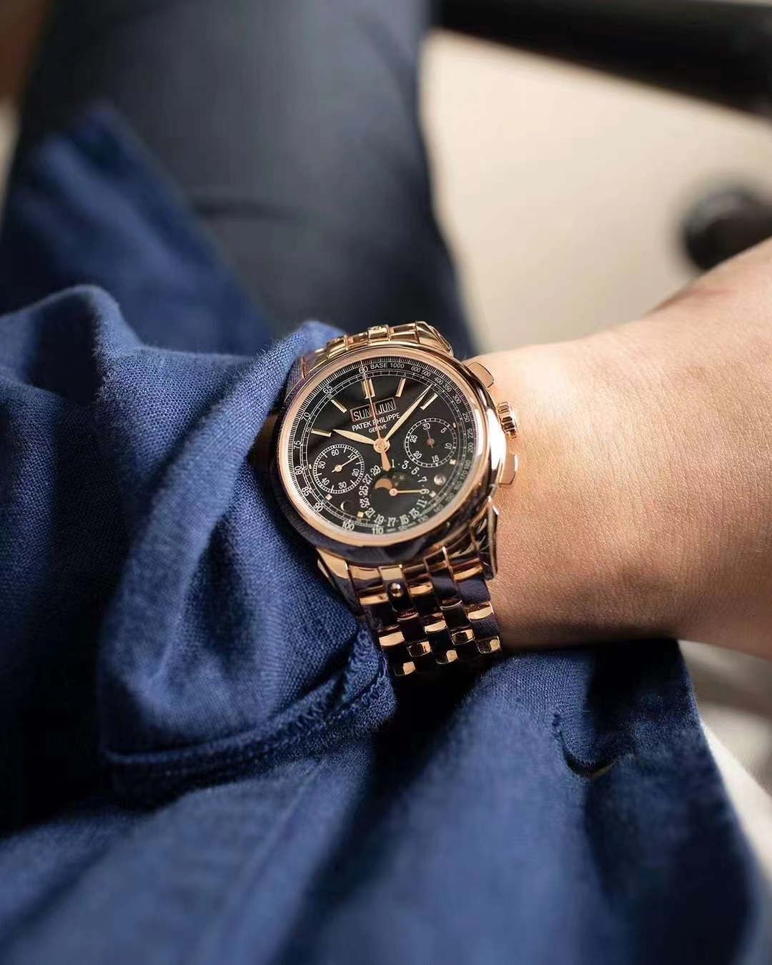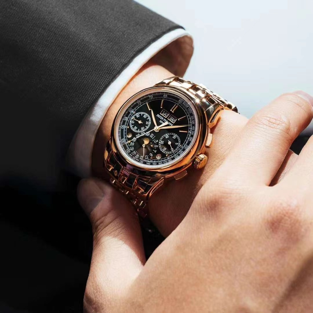腕表简介:玫瑰金材质的Ref. 5270男式万年历计时表,搭配百达翡丽独有的金质“Goutte”表链,与表壳融为一体。和谐优雅的乌木黑色日辉纹表盘确保显示清晰,不论是12时位置的星期和月份并排视窗显示,还是6时位置的指针式日期显示。计时指针经过喷砂处理。