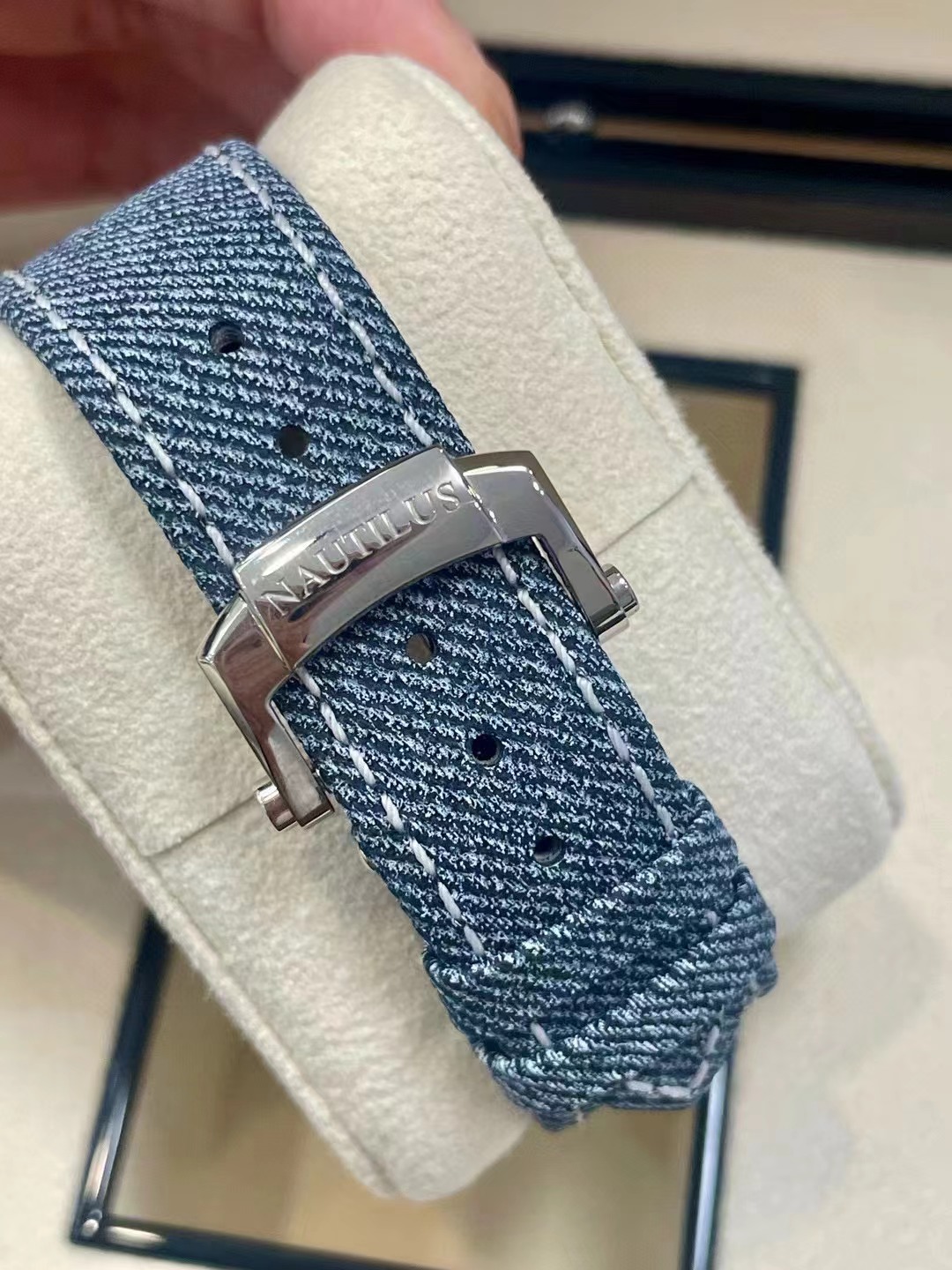 表带材质:小牛皮,手工缝制,牛仔布纹图案(附复合材质,织物图案,灰蓝色表带)