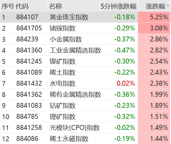盘面上,上午有色金属领涨市场,黄金珠宝、工业金属、镍矿、稀土、钴矿等概念全线走高,汽车、电力、油气、钢铁等板块存在局部行情。白酒股不振,光刻机、BC电池、血液制品等概念走低。