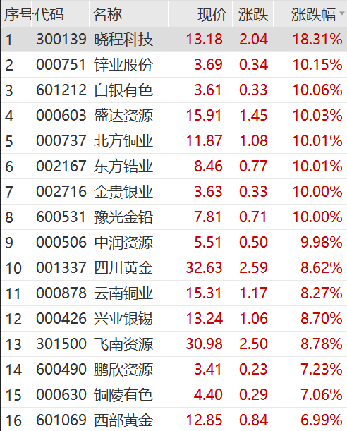 个股方面,晓程科技冲击20CM涨停,莱绅通灵5连板,中润资源3连板,白银有色、东方锆业、金贵银业等多股涨停,四川黄金、山东黄金、西部黄金等跟涨。