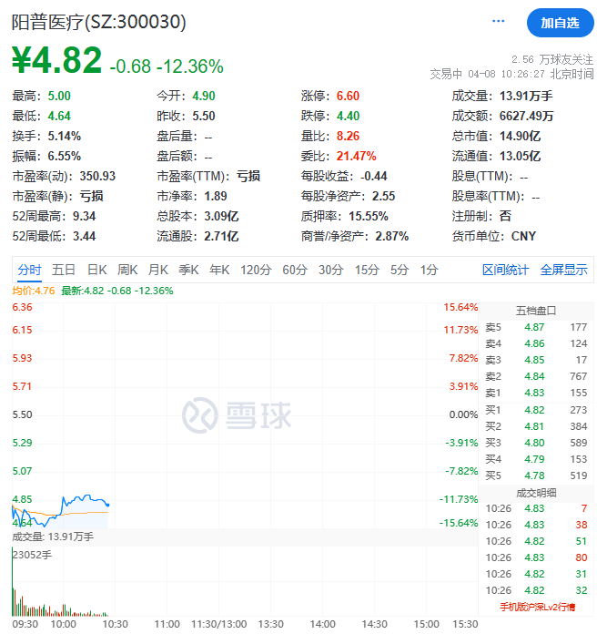 另外,上午阳普医疗盘中跌超15%,股价最低至4.64元/股。