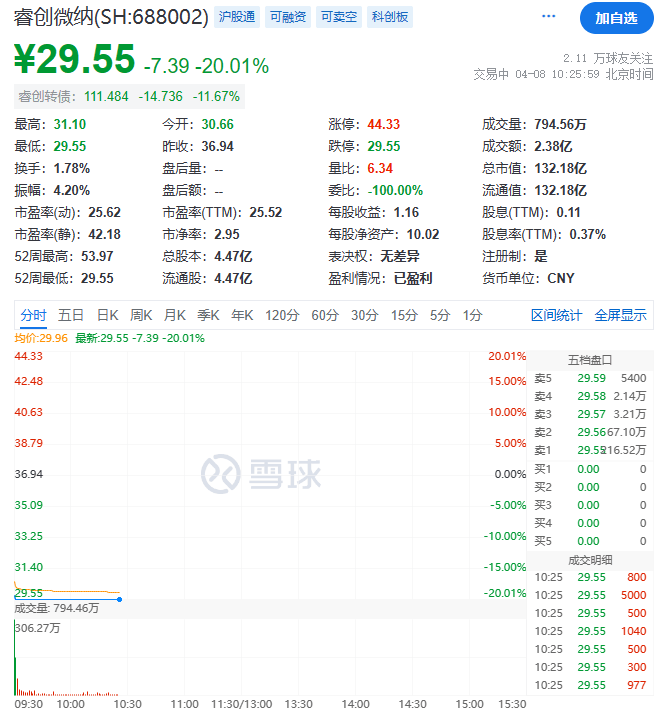 4月8日上午,睿创微纳低开17%,开盘后迅速走出20CM跌停,截至发稿仍未开板。