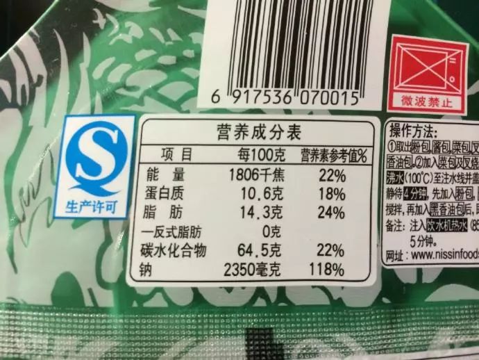 比如说某品牌方便面注明每100克中钠的营养素参考值百分比为118%,这就意味着,这一包121克的方便面落肚,这一天吃的盐就已经超标了。