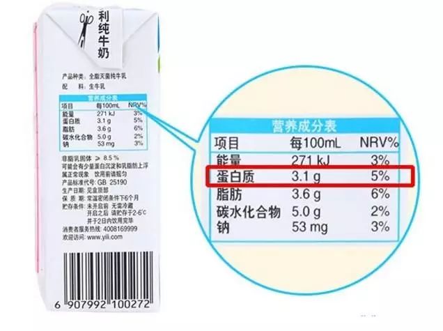 也就是说,在营养成分表中,每100ml全脂或低脂牛奶,蛋白质的含量不应低于2.9g。